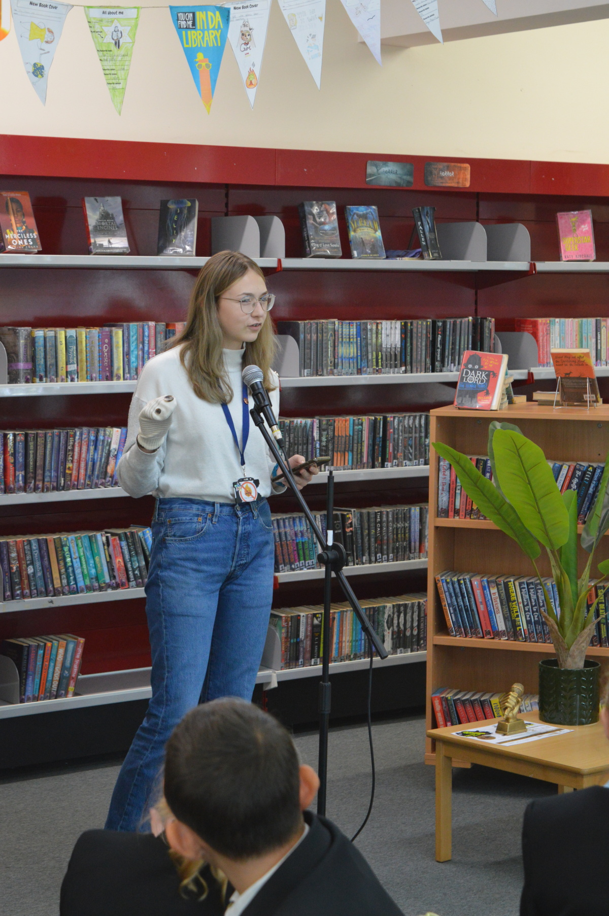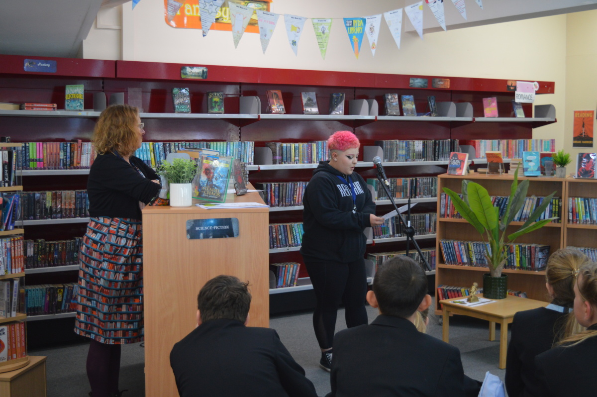Ms Crisp, Librarian said, “Our annual poetry slam competition was held on October 2nd to celebrate National Poetry Day. The competition was open to all students and staff who had to write and perform their own poem to enter. I was really pleased that we had the usual high number of entries again this year with students and staff returning to compete for a second time. All year groups from Year 7 to Sixth Form were represented, with the calibre of poetry written and the bravery of our students quite astounding – I am so proud of all of them. Well done to Laura who won this year’s trophy. We are planning to create a book for the library to include the poems and photos of this year's event for everyone to see.”